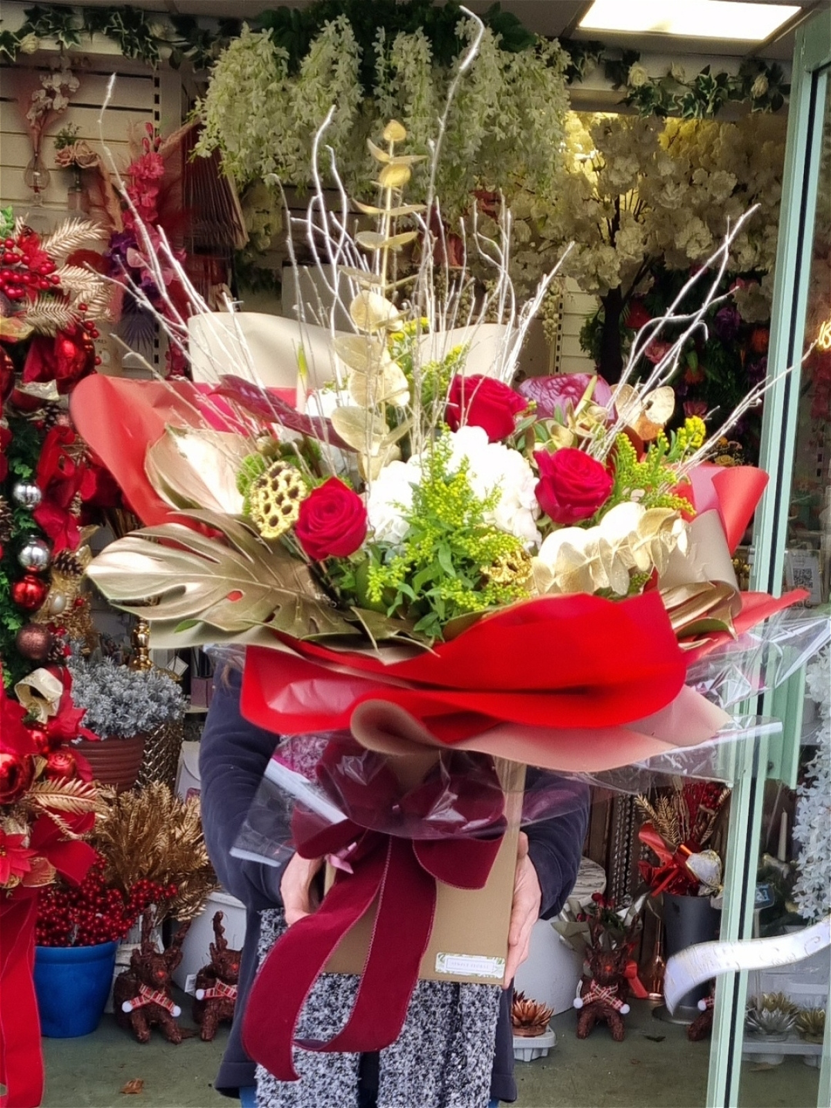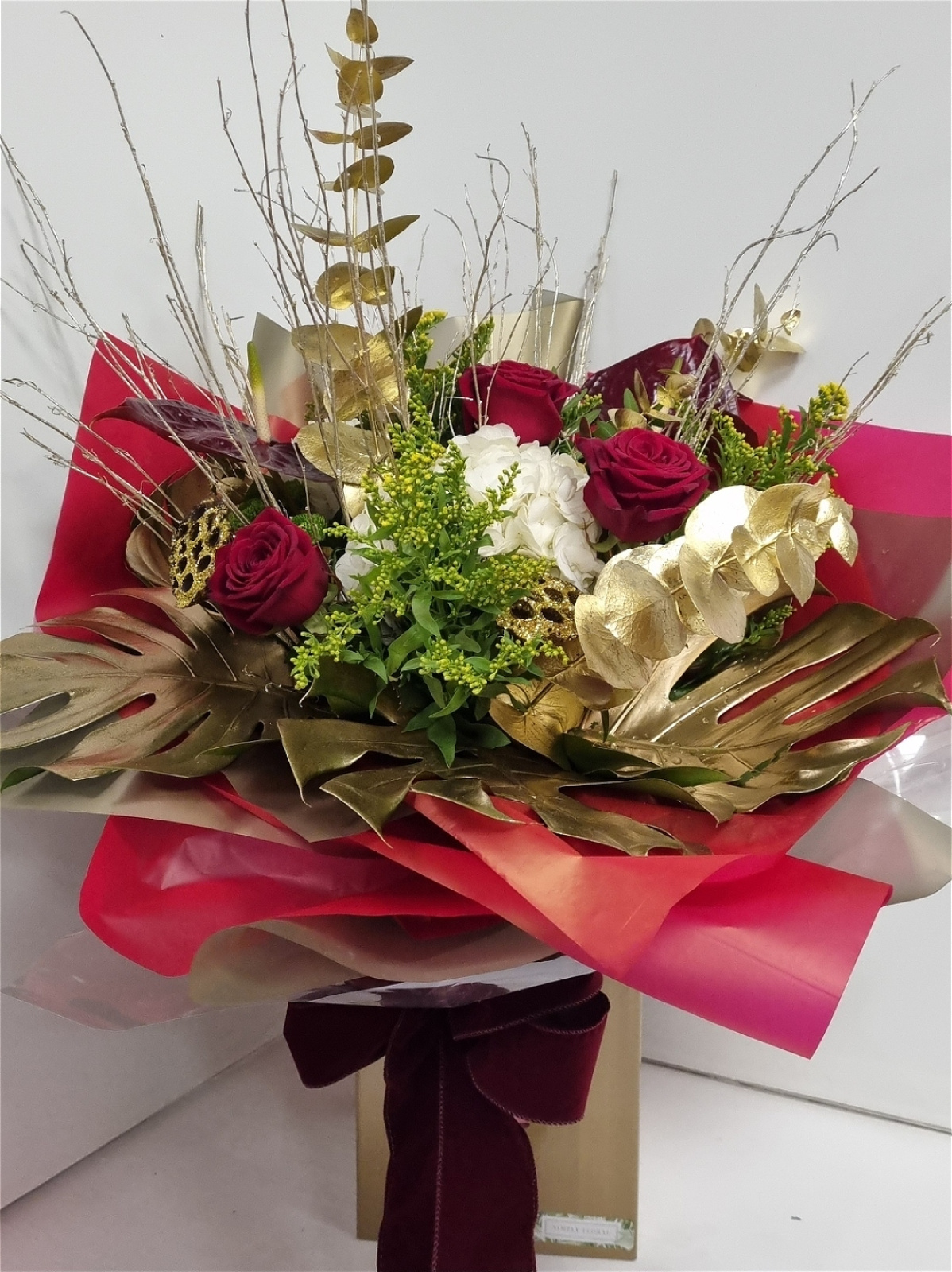 A stunning statement bouquet featuring rich luxury blooms, gilded twigs, pine cones. Radiant, textured, and timelessly elegant this golden arrangement brings festive sophistication to any setting.